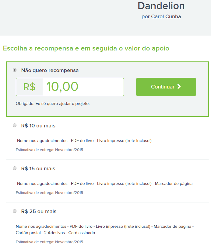 3 - Defina o valor do seu apoio e a sua recompensa.  Você pode optar por não escolher recompensa. O valor mínimo que você pode doar é R$ 10,00, mesmo que esse não seja o valor mínimo do projeto.